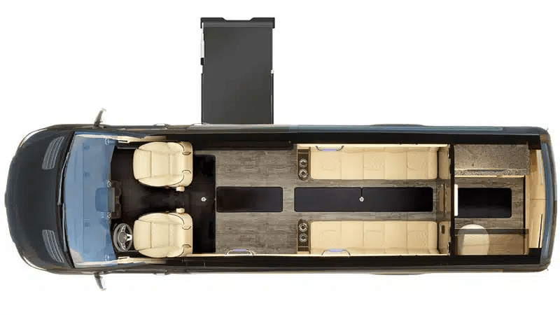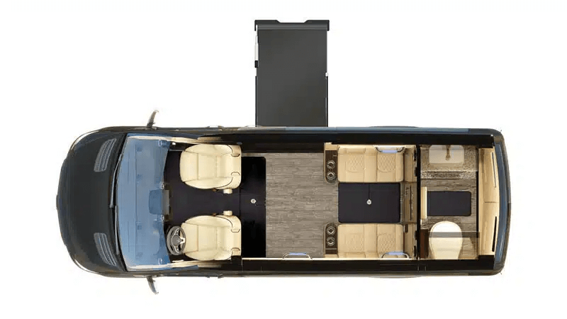 Larger in size with four unique floor plans, perfect for traveling with friends or family. Features extra interior storage for cushions, bags, and mobility supports. Composite wood-grain flooring with non-slip mats ensures safety, while USB outlets at every seat keep all passengers' devices charged and connected.