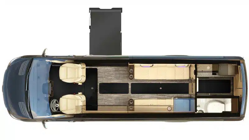 This SUV-sized Sprinter offers exceptional maneuverability and accessibility. Features spacious rear lavatory and galley with ample room to move around, non-slip rubber-backed floor mats for excellent traction, and Smart Control system managing lighting, heating, cooling, and audio—all reachable from a seated position.