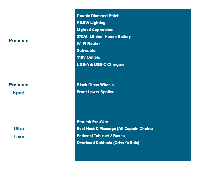 To further personalize your experience, you can add the Premium Sport and Ultra Luxe packages. Each offers a unique collection of enhancements focused on comfort, style, or technology. These packages can be selected on their own or together, giving you the flexibility to build a van that reflects your individual taste and travel needs.
