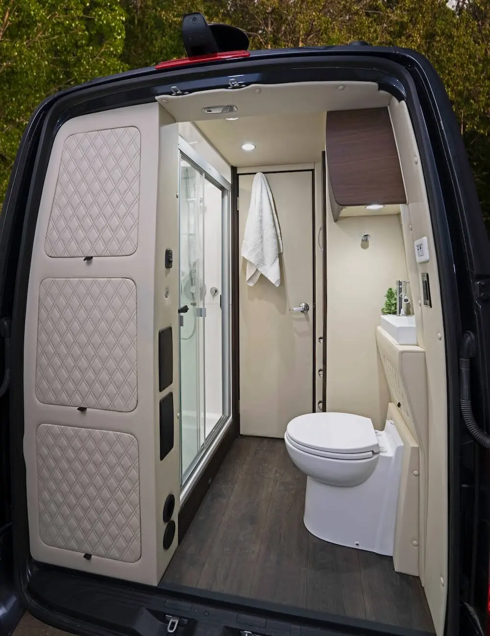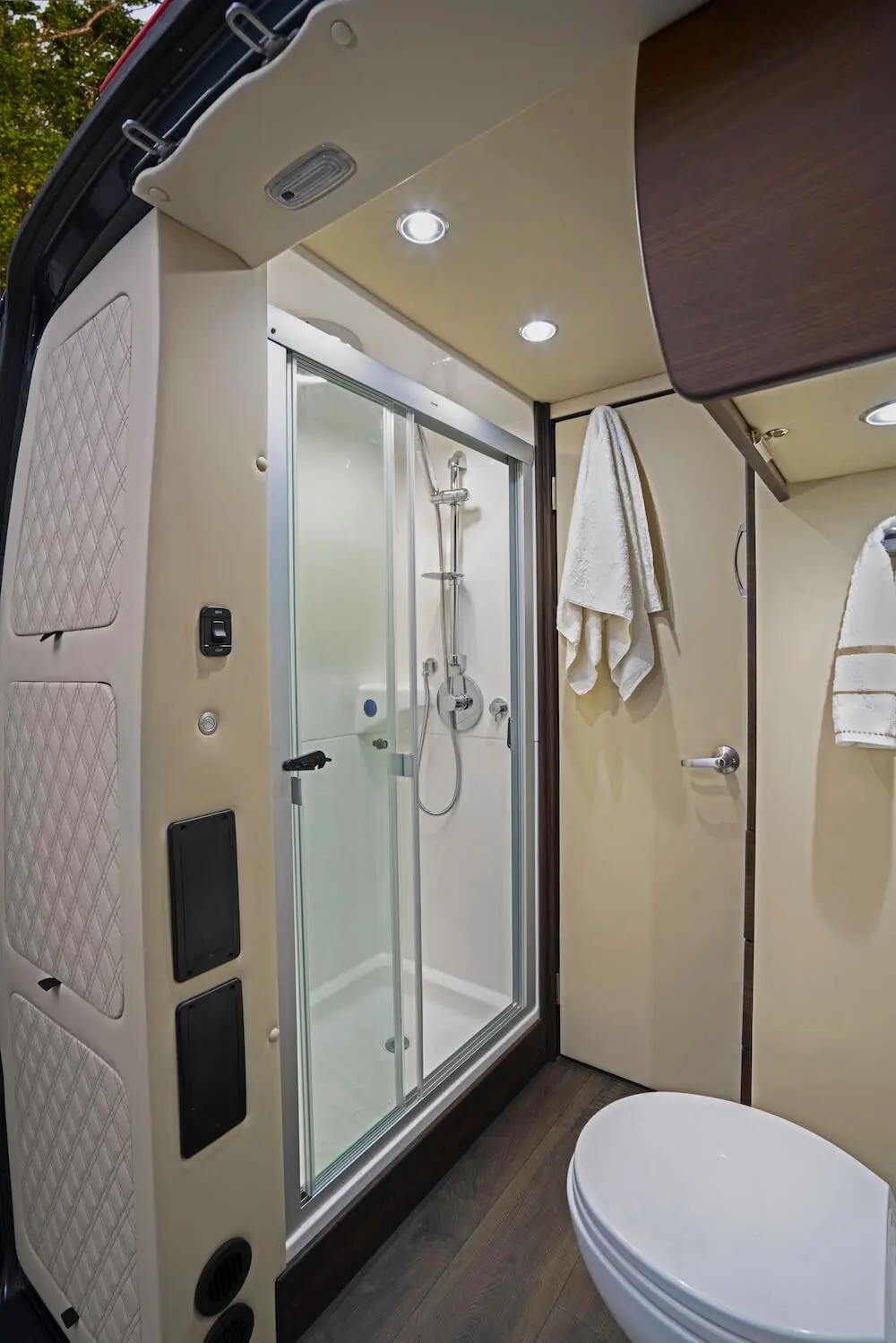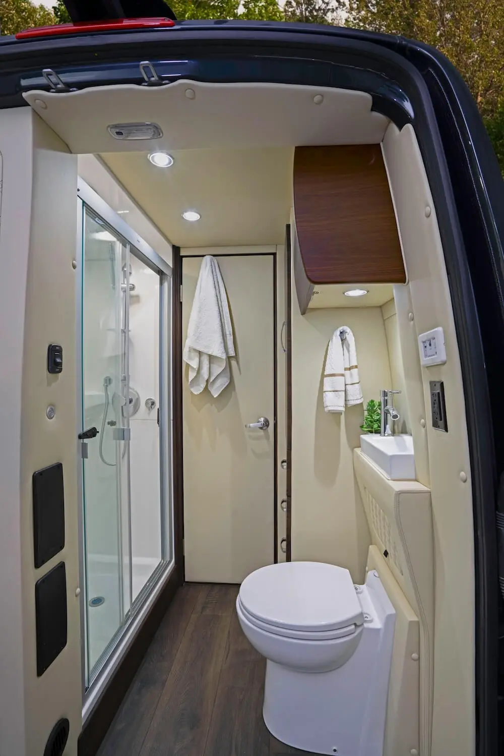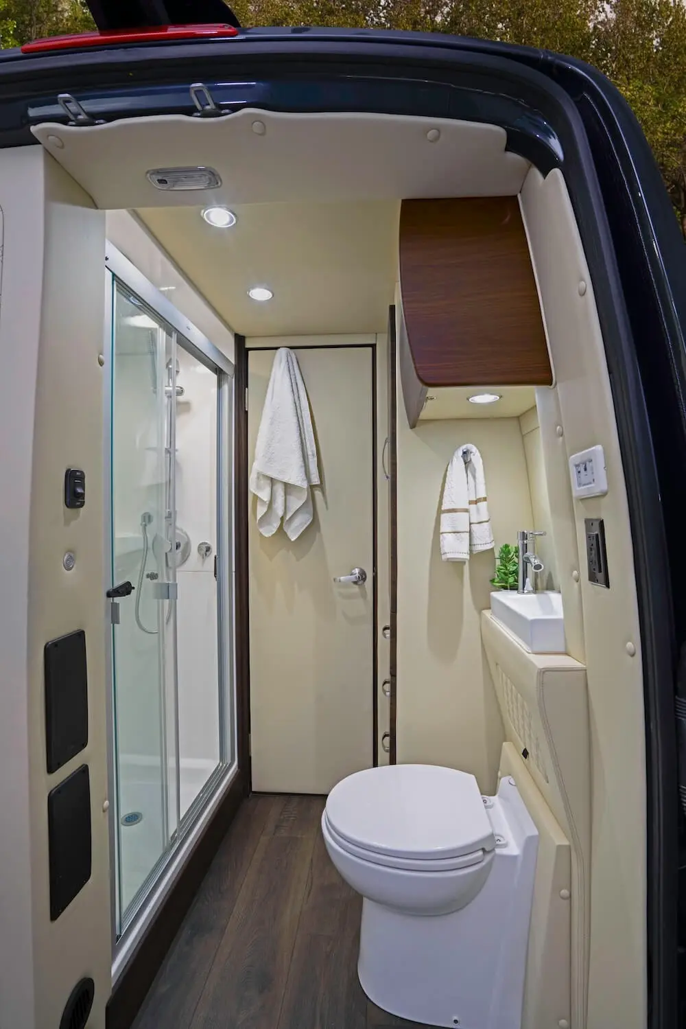 Dry baths comprise separate lavatory and shower areas. Although creating a dry bath without sacrificing floor space in the main living area is difficult, our design team was up to the challenge. Our Ultimate Weekender showcases not only diamond-needle upholstery stitching, a Lagun removable table, convertible fold-out sofas, and custom overhead storage but also the following dry bath elements:
