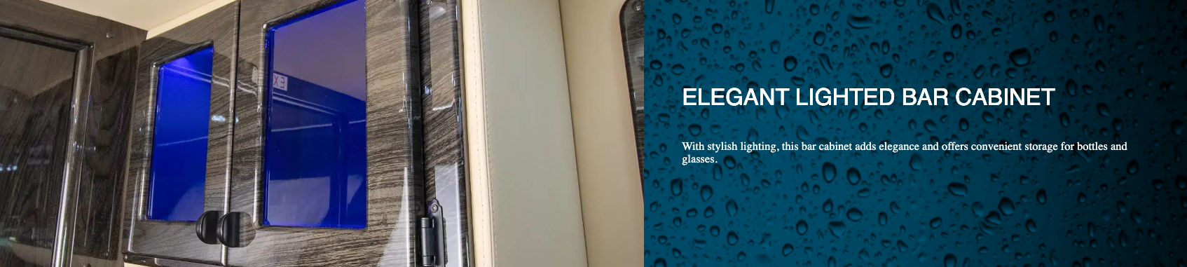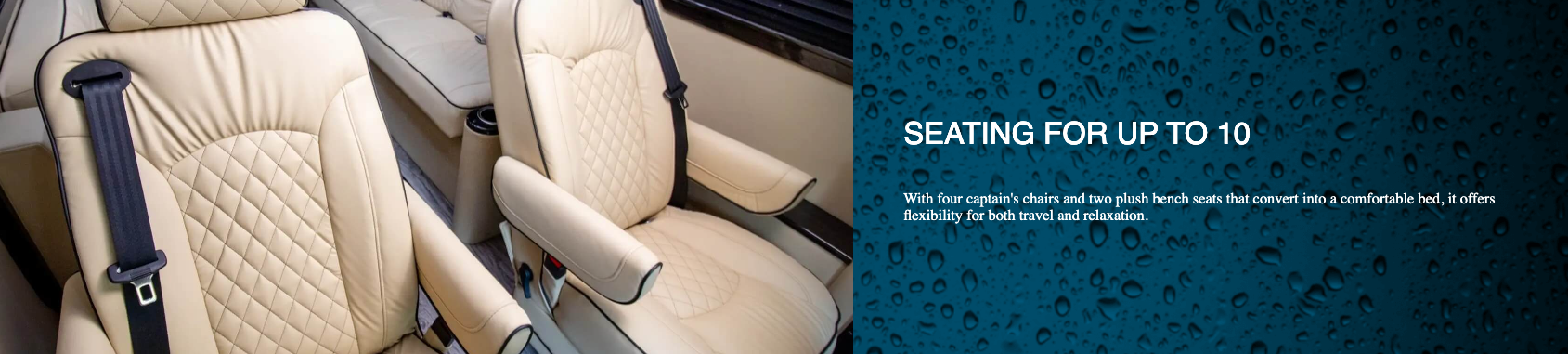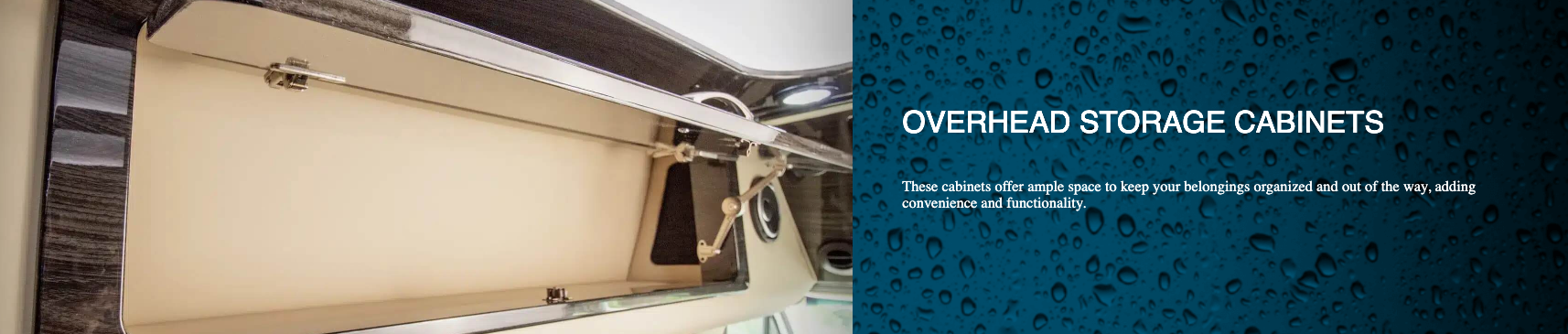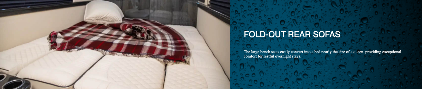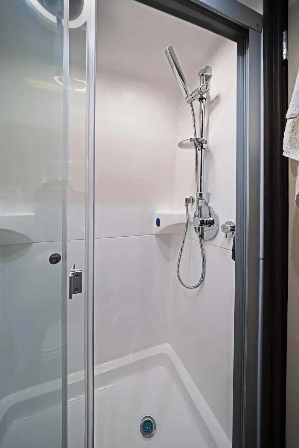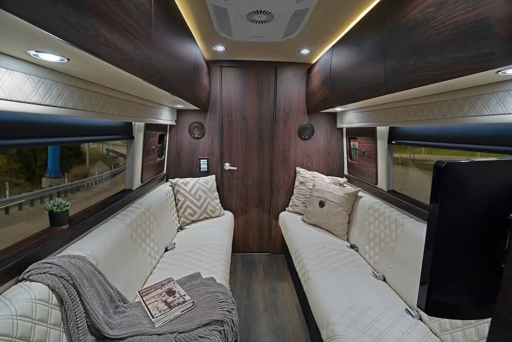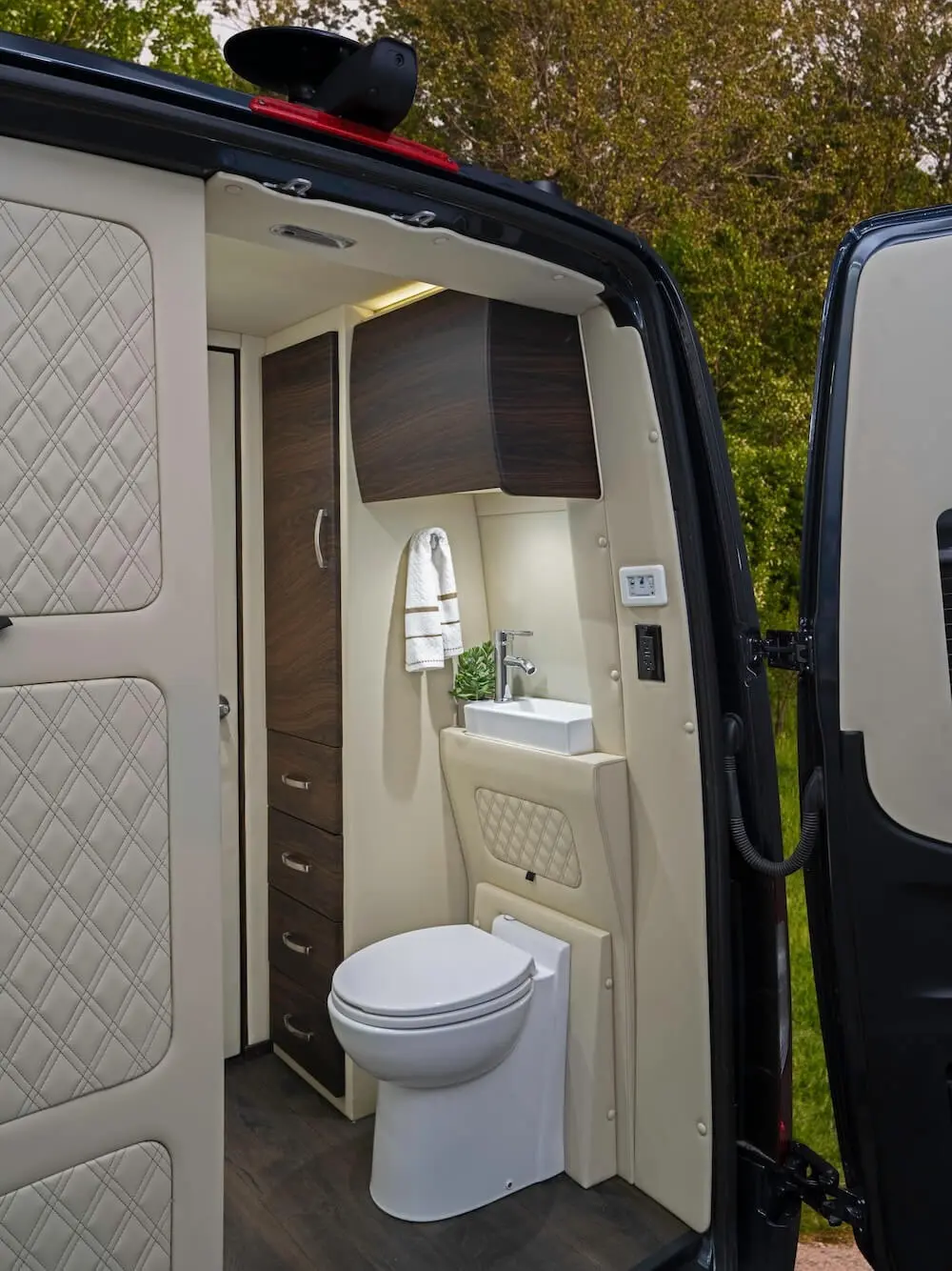 Dry baths comprise separate lavatory and shower areas. Although creating a dry bath without sacrificing floor space in the main living area is difficult, our design team was up to the challenge. Our Ultimate Weekender showcases not only diamond-needle upholstery stitching, a Lagun removable table, convertible fold-out sofas, and custom overhead storage but also the following dry bath elements: